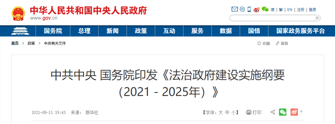 近日,中共中央、国务院印发了《法治政府建设实施纲要(2021-2025年)》,并发出通知,要求各地区各部门结合实际认真贯彻落实。